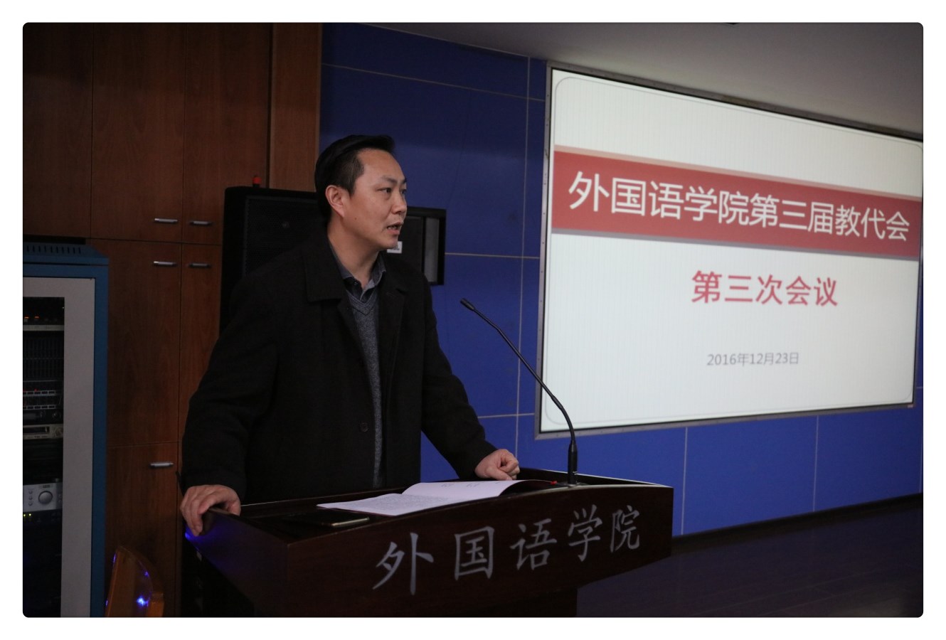 2016年12月23日下午2点,华中师范大学外国语学院第三届教代会第三次会议在三号教学楼3504会议室召开。来自外国语学院行政、英语系、公共外语系、日语系、俄语系、法语系、韩语系的共43名代表参加了本次会议。 本次会议分三个阶段进行;首先罗良功院长代表学院做《外国语学院学科发展规划(2017-2020)》报告。报告从学科现状、学科发展目标、学科发展思路、学科发展措施四大板块进行了规划。