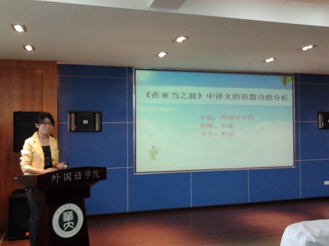 此次活动的主讲人是2011级英语语言文学班的杜洁。主讲题目为“《在亚当之前》中译文的语篇功能分析”。主讲人基于Halliday语篇功能理论,从主位结构和衔接系统两方面分析杰克·伦敦的《在亚当之前》及廖美珍老师的译文,并从文中选取了四个实例进行分析。分析表明译作忠实于原文,翻译方法灵活,语言生动有趣。另外,主讲人还介绍了在此领域卓有建树的黄国文教授的分析方法。