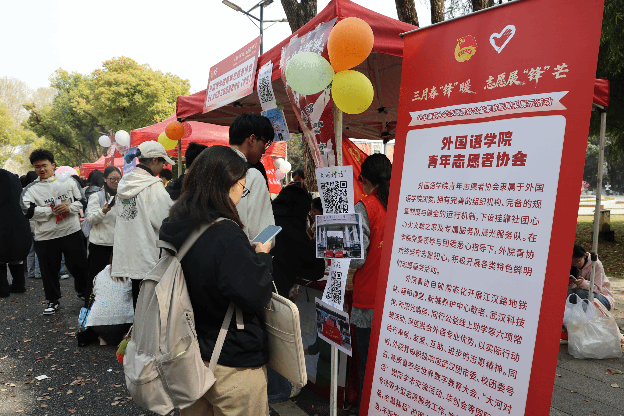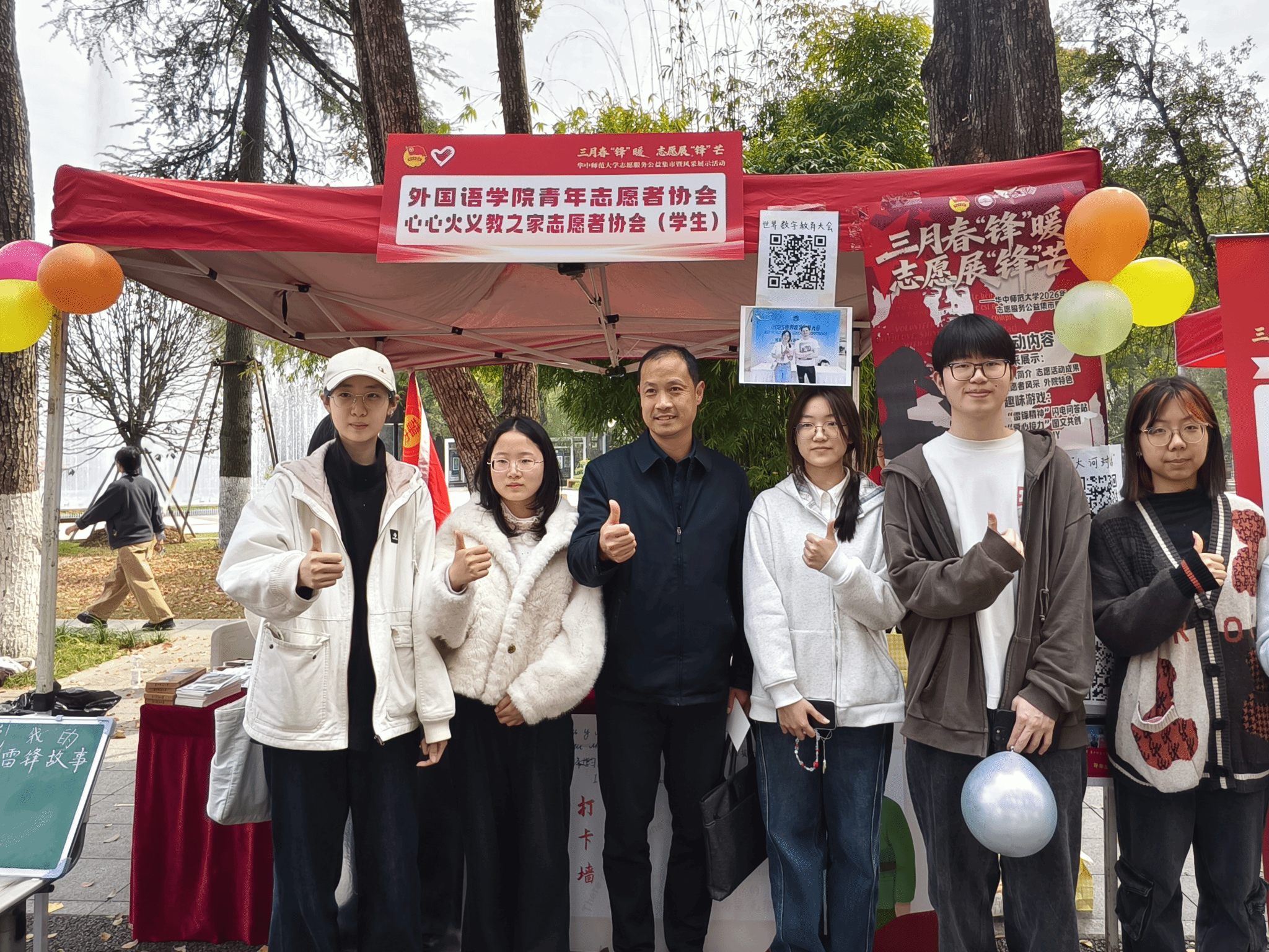 3月25日下午,华体会平台(以下简称“外院”)积极参与华中师范大学2026年“三月春‘锋’暖,志愿展‘锋’芒”志愿服务公益集市暨风采展示活动,旨在弘扬雷锋精神,展示志愿服务特色与成果。外院党委副书记罗舰到场指导,学院团委副书记(学生)伍语涵、主席团成员魏正扬及学院青年志愿者协会、挂靠社团学生代表参加活动。